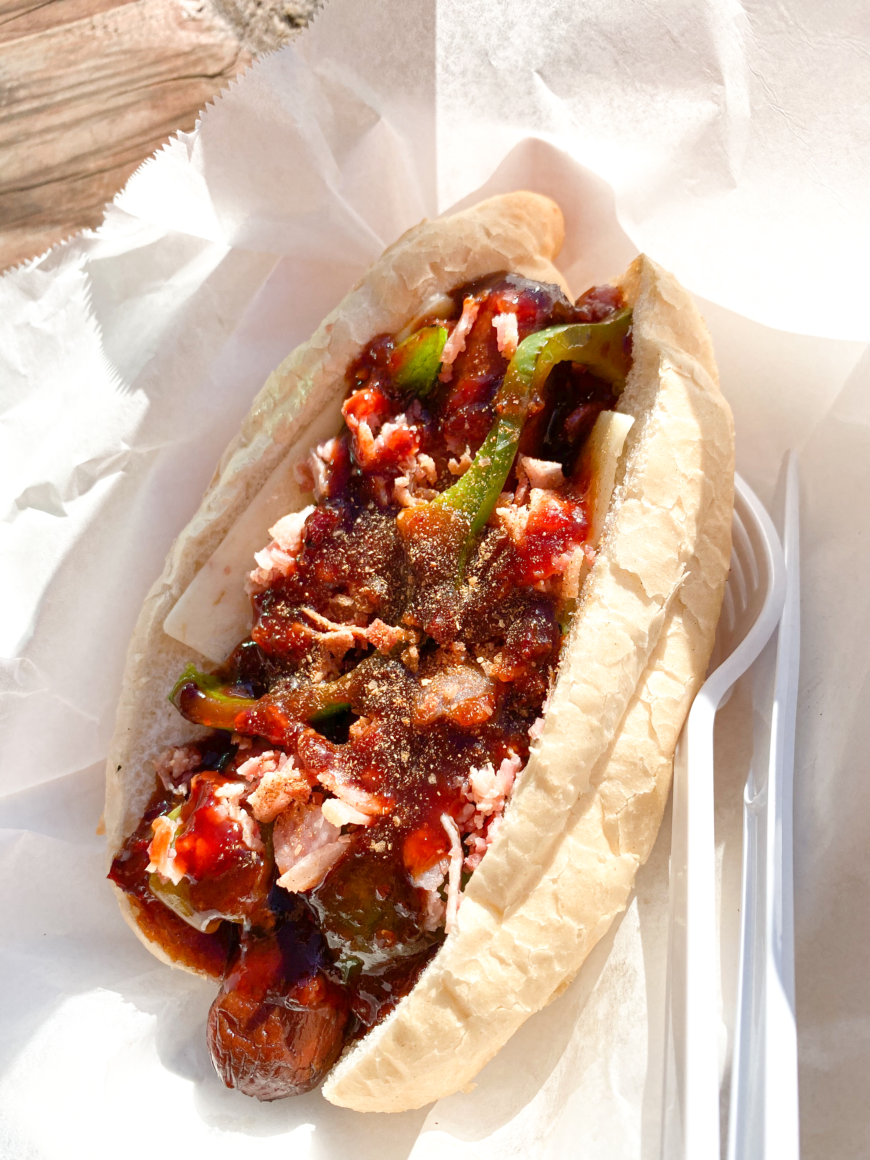 I ordered the Bacon Bacon Jamaican hot dog meal. The meal comes with chips and a drink and the hot dog is topped with sliced crisp bacon, pepper jack cheese, jerk seasoning, bell peppers and sweet chipotle sauce. Ya’ll…. π©ππ½