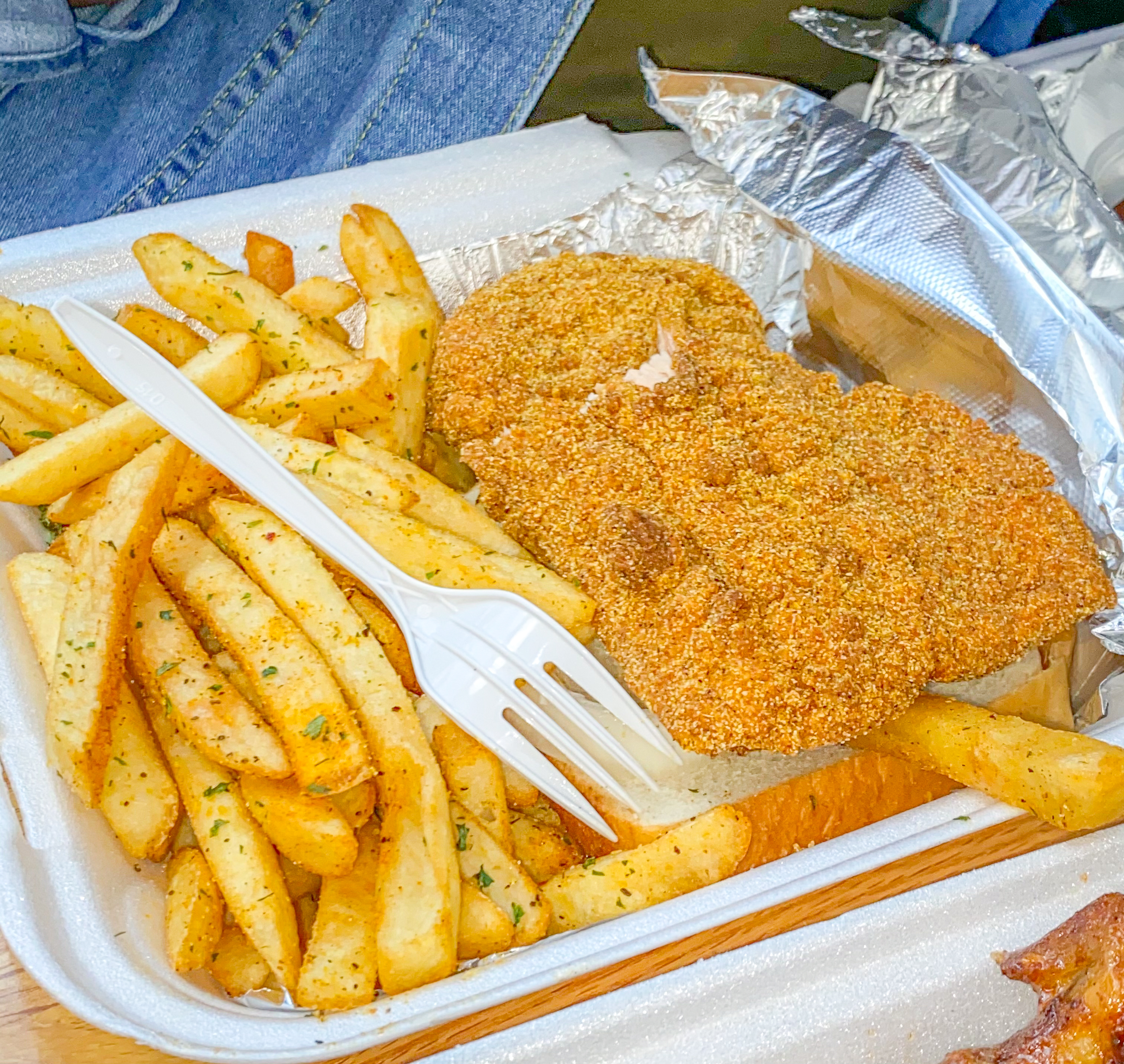Carmen got the Cajun Fried Salmon Fillet and Fries and she also got the Fried Chicken Wingzz with Busted Sauce. I tried some of her fries and a wing and let me tell you something… that wing was winging like a wing has never winged before. It was so good!