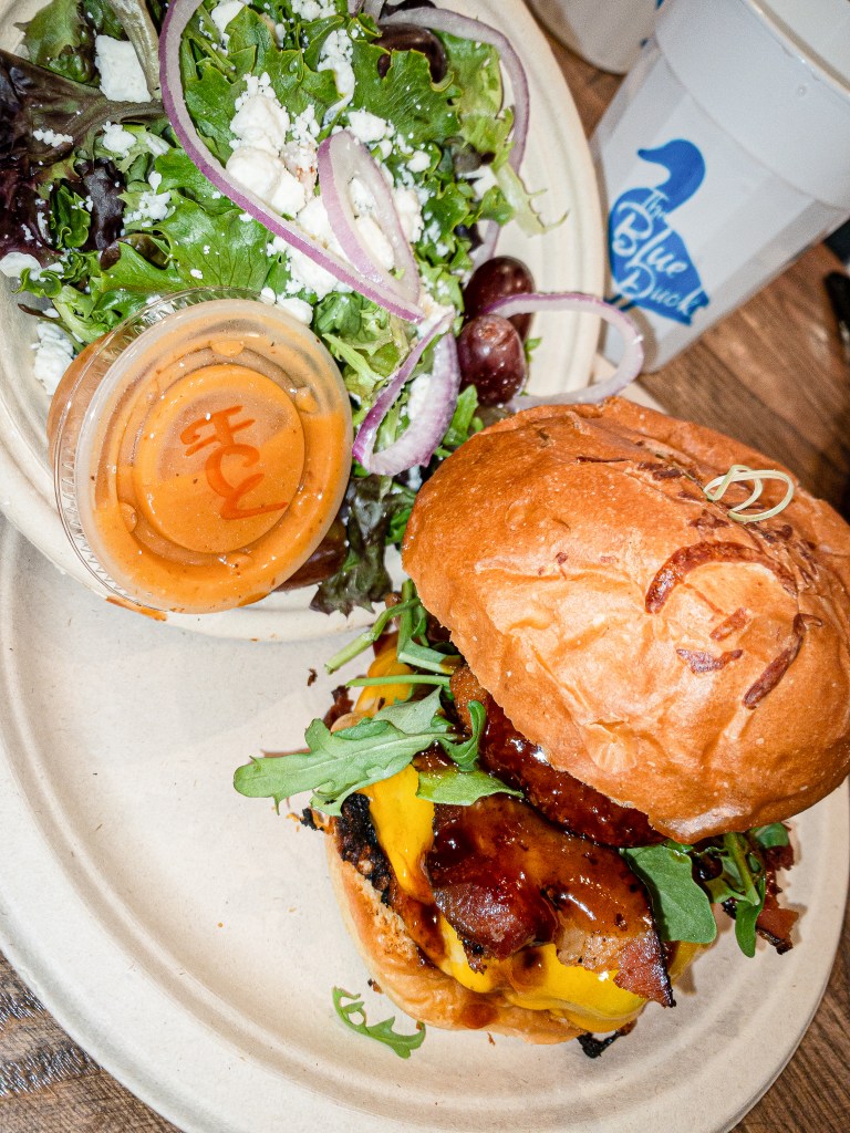 The burger was so juicy and cooked perfectly and it’s made up of a BBQ rub, bacon, yellow cheddar, white cheddar, onion rings, arugula, sweet BBQ sauce, and red eye mayo on green chile brioche bun. For my side, I chose their side salad which was also really good.