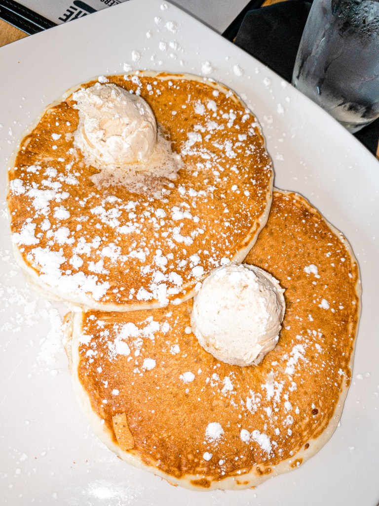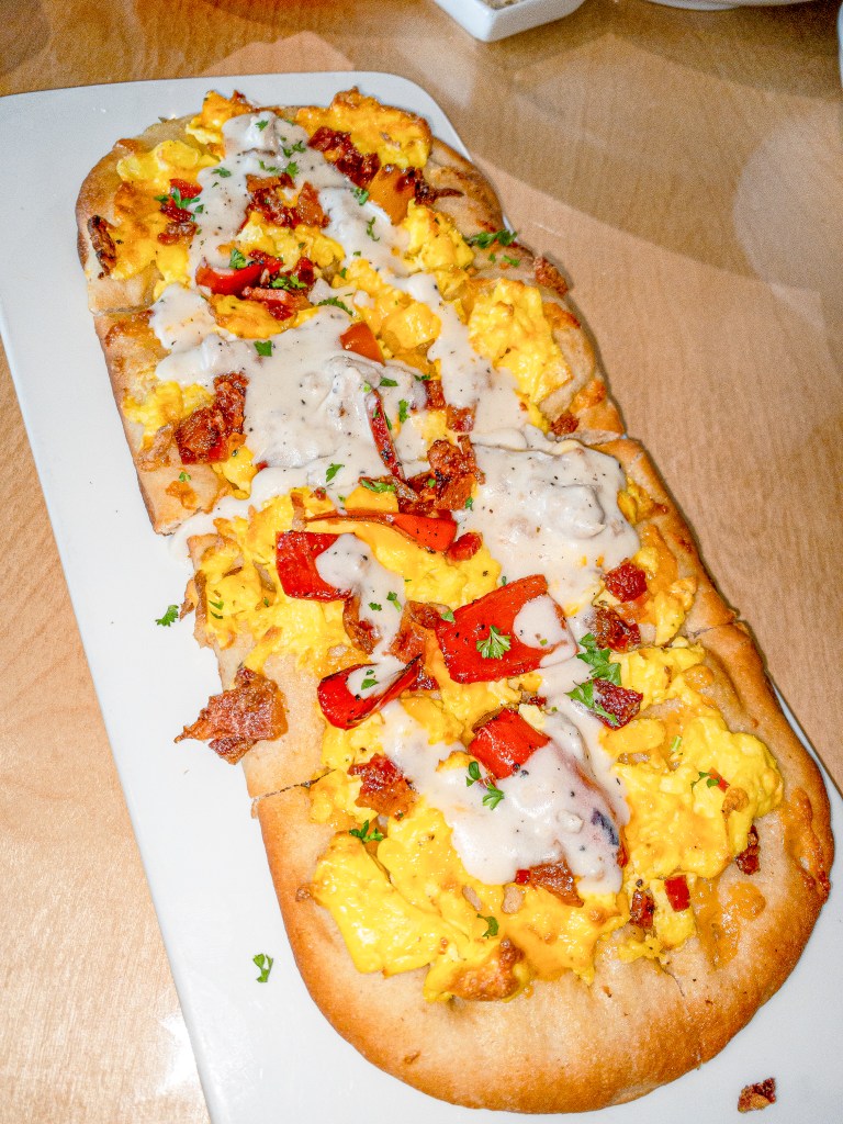 For my entrée, I chose the Breakfast Flatbread and a side of pancakes that were topped with their Cinnamon Brown Sugar butter. The Breakfast Flatbread is topped with scrambled eggs, sautéed peppers, bacon, cheddar cheese, and it’s drizzled with sausage gravy. Ya’ll…it was so good!