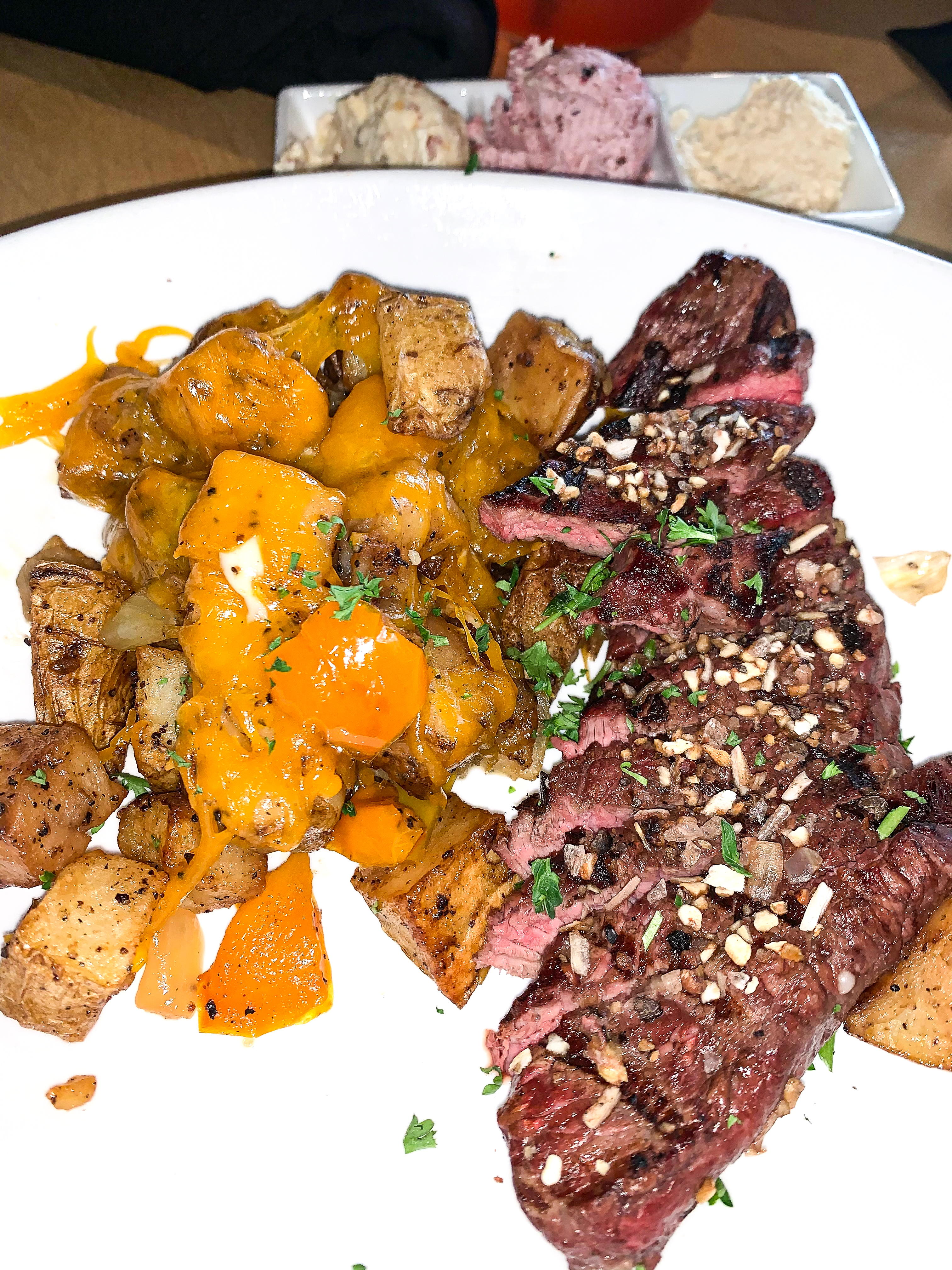 Candace’s entrée was the Steak Hash and she also got a side of bacon. The Steak Hash comes with roasted potatoes mixed with onions and peppers and it’s topped with cheddar cheese. You can get the 6 oz sirloin cooked anyway that you would like and it also comes with two eggs which she didn’t get due to not liking them.