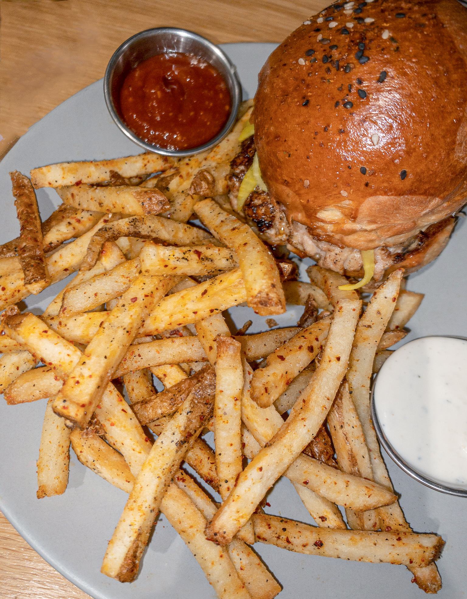I then ordered their Jamaican-Spiced Chicken Burger ($16) and my sisters ordered the Warm Mini Lobster Roll($22) and the Coconut Fried Shrimp ($15) Their Jamaican-Spiced Chicken Burger was absolutely delicious and it’s made with smoky aioli, pickled carrot, daikon, cilantro and it comes with a side of Beef Frat French Fries. That chicken burger was full of flavor and it was also very filling. I would highly recommend it if you’ve never tried it before. My sister’s also really enjoyed what they ordered as well. I didn’t try her lobster roll but that Coconut Fried Shrimp was
